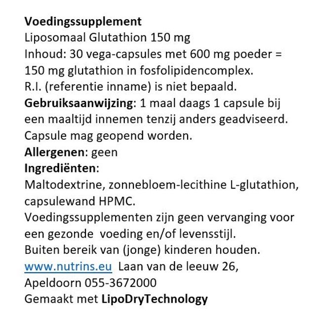 Nutrins bevat geen alcohol, geen suiker (glycerine) en geen soja. De producten zijn langer hodbaar gemaakt door het toevoegen van een veilig conserveringsmiddel. De liposomale supplementen worden na produktie en na het afvullen gekoeld bewaard.
