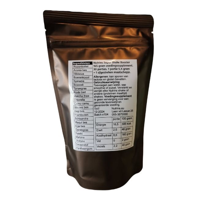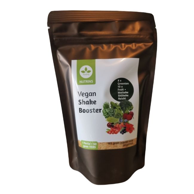 De Shake booster is een combinatie van onze bekende bessenmix aangevuld met een groenten-mix en drie paddenstoelen: reishi, maitake en shiitake.