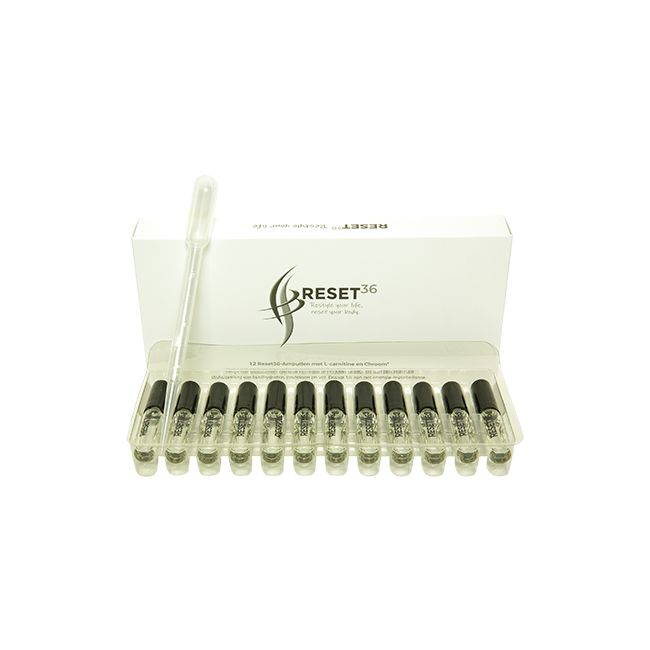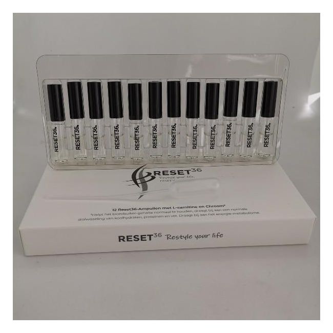 12 Reset36-Ampullen met L-carnitine en Chroom* *Helpt het bloedsuiker-gehalte normaal te houden, draagt bij aan een normale stofwisseling van koolhydraten, proteïnen en vet. Draagt bij aan het energie-metabolisme. Draagt bij aan een normaal vetmetabolisme, de basis van je reset.