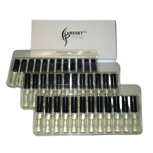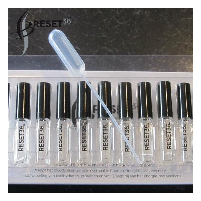 De Reset36-kuur bestaat uit 3 x 12 ampullen dagelijks te gebruiken. Binnen 5-6 maanden na de kuur eventueel 1 – 2 x een interventie-kuur van 12 ampullen gebruiken. Verleng de 36-daagse kuur met 12 of 24 dagen. Combineer met multi + probiotica. De Reset ampullen zijn onderdeel van een 36-daagse kuur aangevuld met voedingssupplementen (vezels, probiotica, vitaminen, mineralen) en advies van een coach. Voor een optimaal resultaat volg de richtlijnen (recepten, advies en informatie) op de Reset36 website